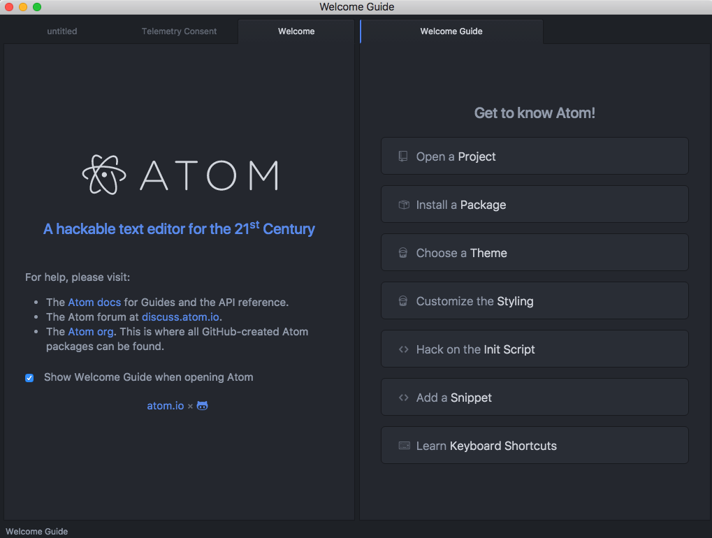 Atom, garatzaileentzako GitHub-eko garatzaileek egin dute, beraz argi dago ez dela proiektu xume eta txiki bat. Garatzaile profesional asko ditu atzean eta Sublime Test-ekin gertatzen den bezala, plugin aske eta tresna ugari daude eskuragarri. Instalazioaren aldetik ez dago berezitasunik. Sistema eragilearen araberako instalazio arrunta da eta lehen aldiz exekutatzerakoan lagungarria den gida bat exekutatzen da.