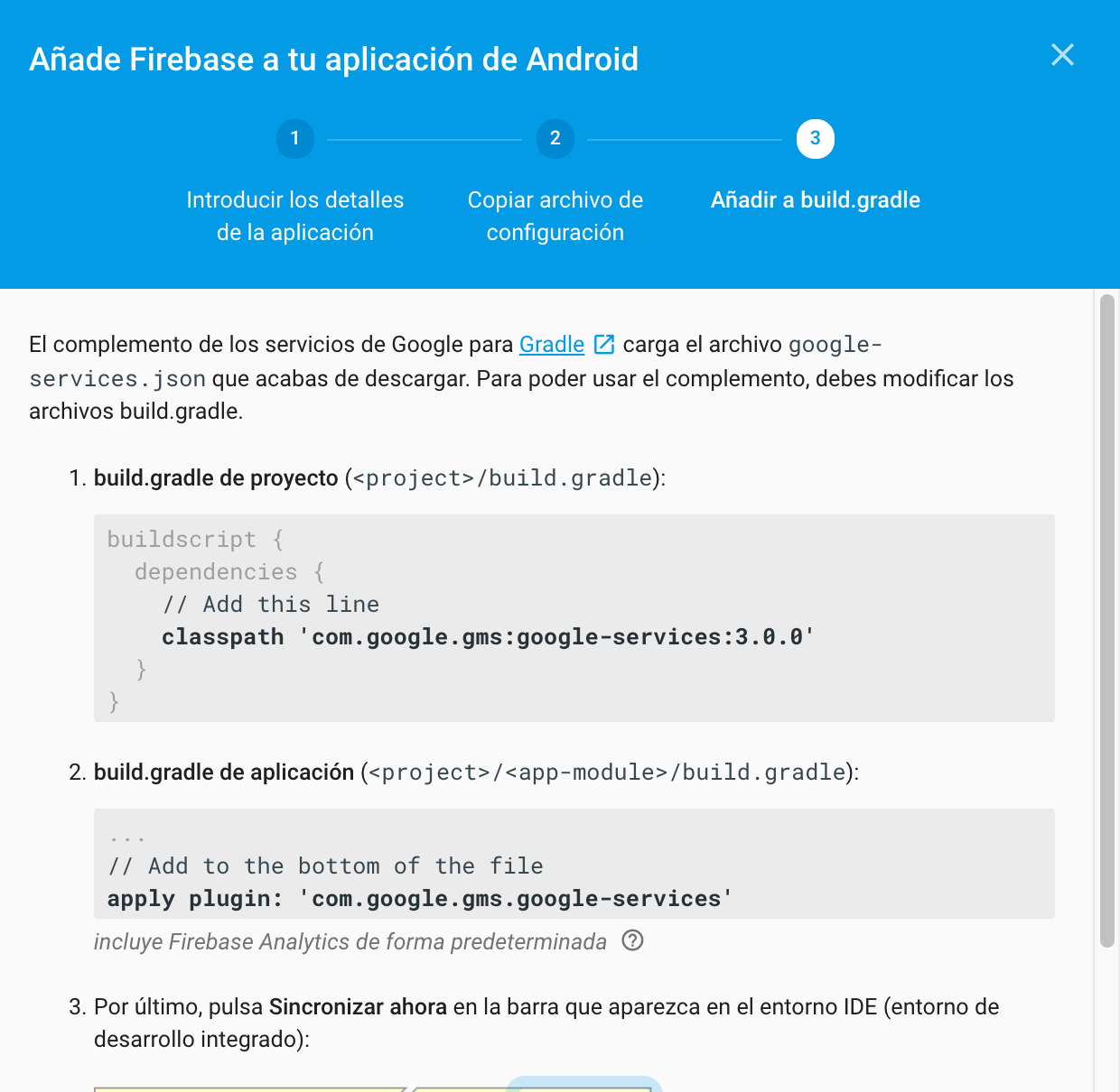 “Añade Firebase a tu aplicación de Android”en klikatuz hiru datu eskatuko dizkizu. Aplikazioaren paketearen izena (Android proiektua sortzerakoan idazten duguna), aplikazioarentzako ezizen bat eta SHA-1 sinadura.